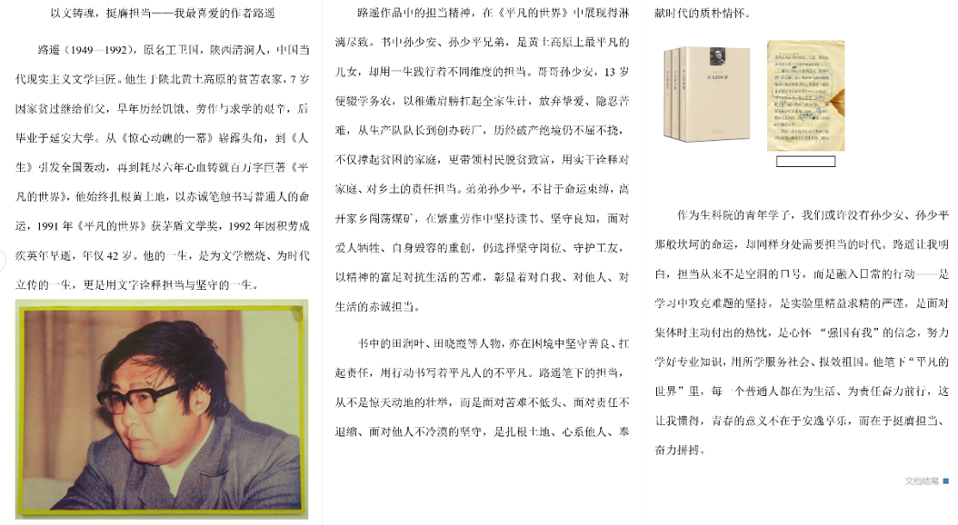 本次活动以“以文润心,以书铸魂”为核心理念,面向生科院全体学生征集推荐短文。活动自发布以来,得到了同学们的积极响应。参与者需提交一篇1000字以内的短文,内容涵盖作者简介、推荐理由、作品中体现的担当精神及个人感悟,用真挚的文字解读文学作品中的责任与坚守,传递新时代青年的家国情怀与青春担当。